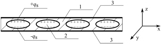 The cross-section of the bubble electret-elastomer transducer is shown in Figure 1. The piezoelectric transducer contains two essential layers: external elastomer filling as the forming layer (1), and an active electret layer consisting of gas bubbles with bipolar charge ±qs distributed on their inner surfaces of the thin electret “shell” (2). Also the two rigid metal electrodes were applied on the outside sides of the sample (3).