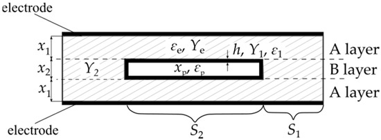 A simplified model of a single electret bubble immersed in an elastomer is presented in Figure 2. The model, with cylindrical symmetry (structure axis perpendicular to the layers surface), consists of three main layers: two A layers made of elastomer, characterized by elasticity coefficient Ye and a thickness of x1, and a non-uniform B-layer with a total thickness of x2, made of an electret bubble and elastomer surrounding characterized by the equivalent Young’s modulus, Y2. The electret bubble has uniform walls with a thickness of h and is made of dielectric characterized by its Young’s modulus—Y1—and electric permittivity—ε1. The properties of the gas layer are given by gas-void bubble thickness xp and gas electric permittivity εp.