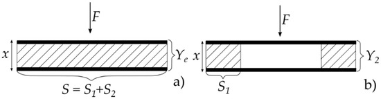 Deformation of (a) plain elastomer layer and (b) elastomer-ring, under external stress F, where x is the thickness of both layers, Ye—Young’s modulus of the plain elastomer layer with the area S, Y2—effective Young’s modulus of the elastomer ring with the area S1.