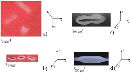 Application of particular thin-wall electret elements in ferroelectrets is necessary due to two fundamental requirements: (1) the charge-storage abilities (the thinner the wall, the higher the surface charge density possible to deposit on the gas void surfaces), and (2) lowering of the effective Young’s modulus of the dielectric composite [11,29]. Ferroelectrets with a coefficient of d33 > 100 pC/N contain a great deal of gas inside thin-wall tube-like electret channels, which makes them very pliable to heavy strain. The piezoelectric properties of ferroelectrets can be determined using two-, three- or multi-layer models [11,12]. All of these leads to the conclusion that structures with a relatively high value of d33 can be obtained by: (1) increasing the surface charge density on the inner surface of gas voids, and (2) lowering of the effective Young’s modulus of the whole structure. Moreover, the technical application of ferroelectrets requires material property stability, such as charge or thermal stability in time. The charge stability depends highly on the temperature—the higher the temperature, the faster the charge decay. For PTFE, thermal stability reaches 130 °C [30]; the charge stability may last years, and chemical processing leading to improved charge stability is possible [31]. In addition, ferroelectret-based transducers are characterized by a low coupling factor, but the extremely low acoustic impedance of such materials compensate for this [32]. It should be noted that the number of electret materials (exhibiting a high value of Young’s modulus, Y) and their processing properties are limited, so new solutions are being explored.
