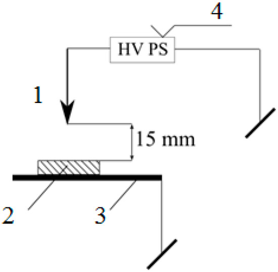 An arrangement for corona-charging of samples, where 1—needle electrode, 2—sample, 3—grounded table, and 4—high voltage power supply.