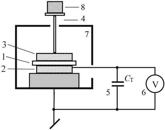 An arrangement for measuring the piezoelectric coefficient d33 using a static method, where 1—sample, 2—isolated measuring electrode, 3—grounded electrode, 4—pan, 5—total capacitance CT, 6—electrometer, 7—Faraday’s cage, and 8—load.