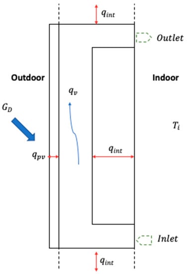 The heat balance of the BIPVT system is presented in Figure 2. It considers the solar gains and conductive and convective heat fluxes throughout the module. The heat transfer through radiation within the system was ignored in this scheme. In this scheme, qint stands for heat flux through the interior elements, qpv for heat flux through the photovoltaic module, qv for convective heat flux and GD for direct solar radiation.