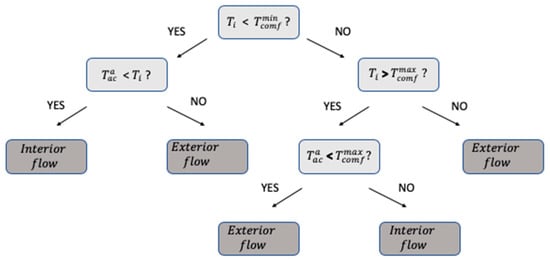 The proposed control logic process for the automatic operation scheme is presented in Figure 3. It takes into consideration: the maximum temperature of comfort () and the minimum temperature of comfort () between which the occupant is considered comfortable (comfort range temperature (); the indoor temperature (); and the air cavity temperature (). The temperatures considered for the operation may be changed according to the occupants’ preferences, in terms of setpoint definition for the smart operation of the system. However, during the development of this work, the range was assumed to be between 18 °C () and 25 °C (). The average temperature of the air cavity temperature () also interfered with the operation of the vents, as it is possible to see in the scheme. It is important to highlight here that the temperatures considered for the air cavity considering the obtained experimental values refer to a punctual value translating the temperature in the sensor’s location, whereas the average temperature accounts for all the sensors located within the air cavity (vertical duct, inlet and outlet).