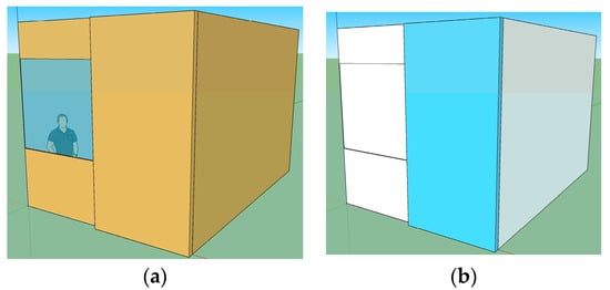The simulation parameters used for the validation model are described in this sub-section and were kept for all the models developed in EnergyPlus in the scope of this work. The main simulation parameters and objects, and the value/option are described in Appendix A. The results obtained for the model using EnergyPlus software were compared with the temperature measurements made within the thermal zones in which the case study was performed. The root mean square error (RMSE) and mean bias error (MBE) were calculated and compared with the maximum allowable values for validation []. To achieve a more accurate validation of the model, two periods were used—from 22 January 2018 to 28 January 2018 and from 15 February 2018 to 22 February 2018—accounting for a total of 14 days. After validating the model, the parametric analysis proceeded. The parametric analysis accounts with different geometries for all the models. The geometries were developed, through the OpenStudio plug-in in SketchUp for the test room with the BIPVT element (Figure 4).