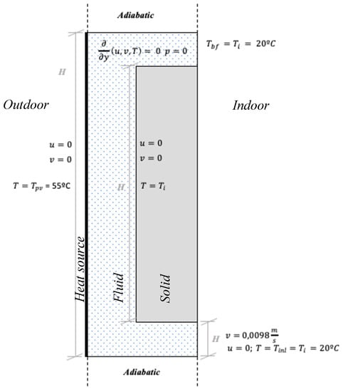 The equations that govern the fluid flow and heat transfer processes inside the air gap formed between the vertical façade solid elements are the equations of mass, momentum and energy conservation []. The fundamentals of the CFD technique are widely discussed in the literature and will not be further described here, besides the basics concerning the simulation set-up used. However, a detailed description of the computational fluid dynamics method may be found in []. For this kind of calculation, it is critical to select appropriate boundary conditions that best represent the system.