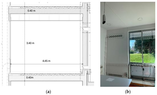 As a brief introduction to the case study, the test room is located in the Solar XXI building from the National Laboratory for Energy and Geology (LNEG). This building was designed as a low-energy-demand building that integrates renewable energy into the main façade and roof. The building integrates solutions and strategies aiming to reduce cooling loads using passive approaches and solutions, namely external solar shading, natural ventilation and passive cooling utilizing 32 buried pipes that exchange heat in the soil. The buried pipe system will not be further described in this work because it was not used during the entire testing period of the test room. For the heating period, the solution and strategies integrated into the Solar XXI building are the optimized envelopes externally insulated and the use of direct solar gain through the south-oriented main façade of the building. More details about the building may be found in [].