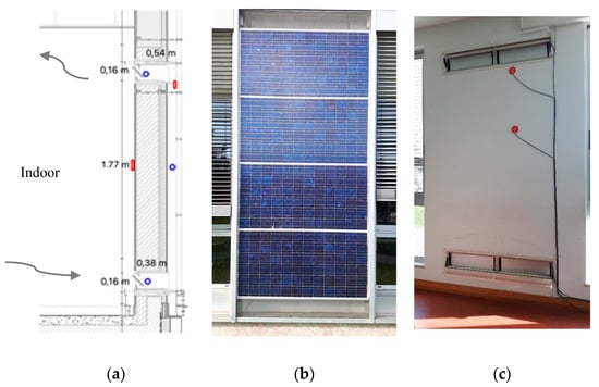 Moreover, the main façade is composed by BIPVT systems that aim not only to generate electrical energy but also act as a natural heat recovery system. These systems are integrated into the main façade and consist of 76 photovoltaic multi-crystalline silicon modules with an area of 96 m2 and a 12 kW peak power. The average productivity is 1004 kWh/kW. The geometry and functionality of the BIPVT system will be further described in the next subsections. The system and test room will be further described in Section 3.
