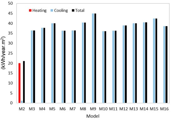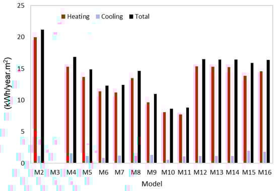 Table 2 presents the scenarios with the blinds open (except M2, that is presented as an exceptional comparison in the table because it corresponds to the BIPVT system without ventilation/air changes with the interior test room and with closed blinds) and accounts for 15 scenarios (14 with the blinds open and 1 with the blinds closed). The scenarios in Table 2 are also simulated with the blinds closed. While M2 corresponds to the model with the blinds closed and without ventilation/air changes with the interior test room, M3 correspond to the same configuration with the blinds open. For the BIPVT, M4 (the reference case, as previously explained) corresponds to the M1 (validation model) geometry configuration, but simulated for the whole year and with fixed parameters of ventilation between BIPVT air cavity and test room, whereas M1 was simulated in a free-floating mode for the validation period only (January and February) and no results for energy needs for cooling and heating are presented. Model 4 is represented by an air cavity thickness of 0.16 m, with a zone mixing airflow of 0.01 m3/s, four PV modules, and a fixed zone mixing scheduled from December to February.