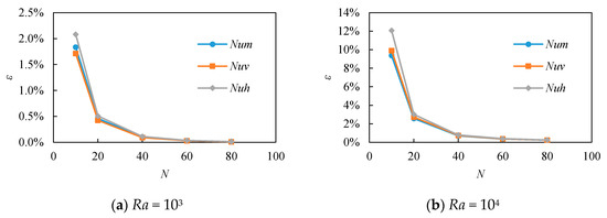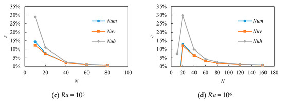 The transition of the error with respect to the grid number is shown in Figure 3. The error decreased exponentially with increasing the grid number except the result with N = 10 at Ra = 106. The error was generally less than 1% with N = 20, 40, 80, and 160 at Ra = 103, 104, 105, and 106, respectively.