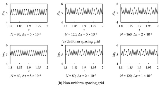 The temporal evolution of Nuh to the non-dimensional time, τ, are shown in Figure 4, where Pr = 0.025, κ = 0.99, Ra = 5 × 105, and Ha = 0. It seems that the characteristics at κ = 0.99 are almost the same as those in a square duct. In the uniform grids, one-period simple oscillation was observed with N = 80, but two-period oscillation was recognized with N ≥ 120, which included double period oscillation in addition to fundamental oscillation. In the non-uniform grids, two-period oscillation was obtained with N ≥ 80.