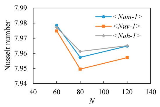 Dependency of time-mean averaged Nusselt numbers, <Num>, <Nuv>, and <Nuh> to grid number, N, at Pr = 0.025, κ = 0.5, Ra = 107, and Ha = 0.