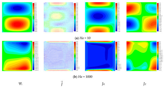 The contour map of streamline of electric current density Ψc, electric current density vectors , radial component of electric current density JR, and axial component of electric current density JZ at Pr = 0.025, κ = 0.5, and Ra = 104.