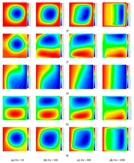 The natural convection was steady at Pr = 0.025, κ = 0.5, and Ra = 104. Figure 8 shows the contour figures of Ψ, P, Θ, Ψc, and Ψe at Ha = 10, 100, 200, and 1000. The contour patterns at Ha = 0 were almost the same as those at Ha = 10. Therefore, those at Ha = 0 were omitted. The natural convection was damped by the effect of the Lorentz force at high Hartmann numbers. As a result, the pattern of Θ was closed to the heat conduction state with increasing the value of Ha. In regard to the vortex of Ψ and Ψe, the center of those vortices moved from the center of the duct to near the cold wall, and the shape of those vortices changed from a circular to a flat shape. The patterns of Ψc were generally anti-symmetric with respect to the horizontal center line. The center of those vortices moved to near the thermally insulated walls upside and downside with an increase of Ha. The patterns of P were circular having a low pressure region in the enclosure center at Ha = 0, but tended to become anti-symmetry similar to Ψc due to the generation of a high pressure region at Ha = 1000.