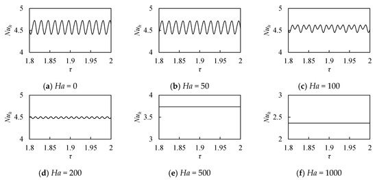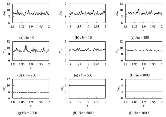 Figure 9 shows the temporal evolution of Nuh at Pr = 0.025, κ = 0.5, and Ra = 5 × 105 for the various Hartmann numbers. The computations were carried out in the range of τ = 0–2. At Ha = 200, a longer time was needed to get the periodic state among the Hartmann numbers investigated. As a magnetic field contributes to stabilize the natural convection, the higher Ha, the smaller the amplitude of oscillation. The flow exhibited oscillation in Ha ≤ 200 and was steady in Ha ≥ 500. The amplitude changed little in Ha ≤ 50 but it became smaller in Ha ≥ 100. Comparing the cases of Ha = 50 and Ha = 100, the waveforms were clearly different, but the time mean values of Nuh were not different even by 1%.