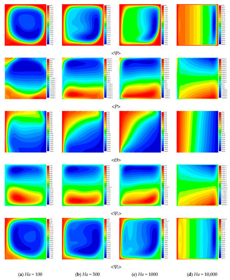 Contour figures for several values of Hartmann number at κ = 0.5 and Ra = 104. From top to bottom, stream function of velocity, pressure, temperature, stream function of electric current density, and electric potential are shown.
