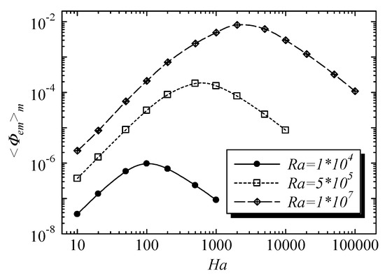 The natural convection changed into a turbulent regime oscillating irregularly at low Hartmann numbers for Ra = 107. The turbulence was damped by applying the magnetic field at high Hartmann numbers. Figure 11 shows the temporal evolution of Nuh. Certainly, the oscillation amplitude of natural convection was suppressed in the range of Ha ≤ 1000 but the Nuh was not influenced significantly. The higher Ha, the smaller the amplitude of Nuh. It became steady in Ha ≥ 5000. The irregular turbulent state was kept without a transition to a periodic oscillation.