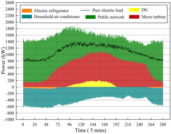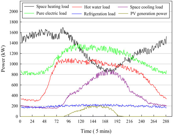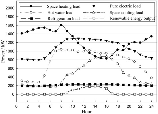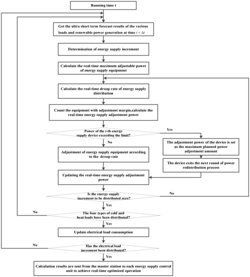 The above real-time operation error correction model takes space heating load as an example for illustration. In the actual operation process, four other types of loads must be considered. Among them, the real-time unbalanced power distribution and adjustment of hot water load, space cooling load and refrigeration load can refer to space heating load. When the adjustment of these four types of loads is completed, the power consumption of all energy supply equipment that consumes electricity for cold or heat energy production is updated. Combining the ultra-short-term electrical load forecast and renewable energy power generation forecast at time , the ultra-short-term forecast results of the net electrical load are obtained, and then the real-time unbalanced power distribution of electrical loads is performed, with reference to the above types of loads.