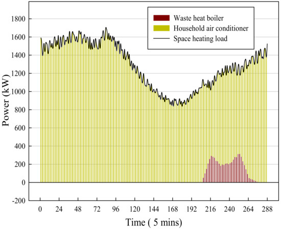 In the above equations, the reason we make the difference is because the forecast is deviated, and the day-ahead dispatching plan is made based on the results of the day-ahead prediction. The day-ahead dispatching plan takes a quite long calculation time and if the results of ultra-short-term load prediction are substituted into the day-ahead dispatching model, the calculation time requirements cannot be met. Therefore, this paper proposes the real-time dispatching model of the integrated energy system. At time , the task that needs to be accomplished is to distribute these load adjustment increments to each energy supply equipment and energy storage device to complete the real-time operation correction. Since the processing methods of various types of load are similar, the space heating load increment distribution is taken as an example for description and the other types of load increment can be distributed with reference to the space heating load.