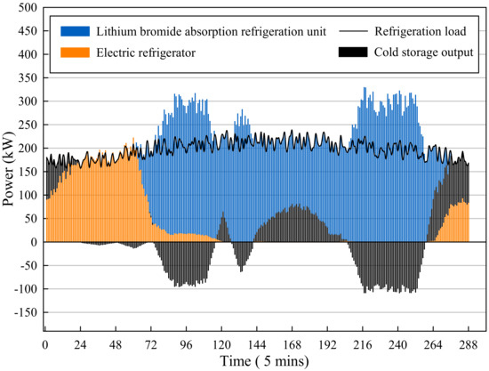 t within the period of low electricity prices at night, the heating or cooling load is greater than expected; then, at this single point of time, the economically optimal dispatching solution for the time interval is to allow the energy storage to undertake the unbalanced power, but as a cost at this time, the energy stored is released and the energy storage capacity is reduced, so there is not much energy to release during the day when the electricity price is high, and the economy of the entire system will be affected. Therefore, from a global perspective, a reasonable approach should be to increase the power output of electric-heat (cold) conversion equipment to compensation the power deficit, rather than the discharge of energy storage equipment with low costs at that time.
