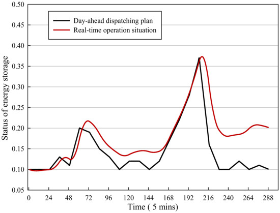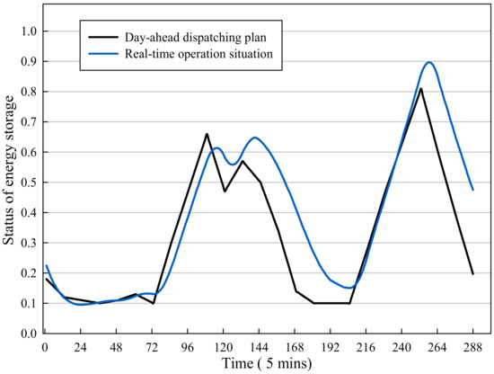 The real-time error correction operation model is a static optimization model which focuses on the single-point operation correction at the next moment and the optimization goal of the model cannot be selected as economically optimal, because in a single moment of operation, the economically optimal scheduling method uses all energy storage to smooth the unbalanced power, which will lead to a large discrepancy with the previously planned operation strategy, resulting in the phenomenon of local optimal operation interfering the global optimal operation.