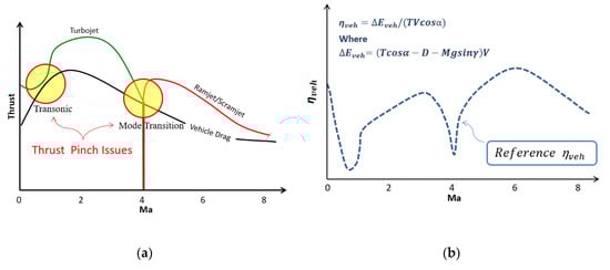 TBCC vehicles suffer from two main thrust pinches [1], as shown in Figure 1a. One is the transonic thrust pinch, and the other is the transition thrust pinch. The thrust pinches are limited by the current performance level of vehicle and TBCC engines. The thrust pinch issues can be described as flight with small acceleration and long acceleration times, which can be measured by vehicle efficiency, [18]: