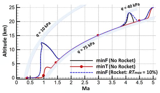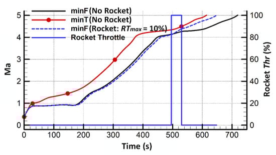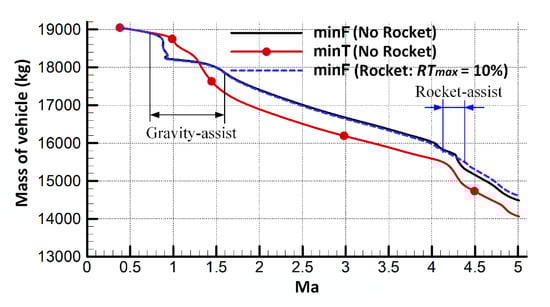 Based on the TBCC model, the rocket with an RTmax of 10% is used to optimize the trajectory of minF, shown as the dashed line in Figure 4. Interestingly, the rocket does not work in the transonic region, but only turns on during the mode transition. Moreover, the vehicle firstly climbs to the limit boundary of the minimum dynamic pressure of 40 kPa and then takes advantage of the gravity-assist to accelerate during the mode transition. Due to the change in trajectory when the rocket works, the local performance of vehicle might be changed.