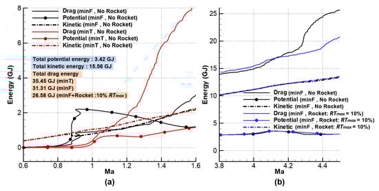 From the perspective of energy, the vehicle climbs from a low-potential and low-kinetic state to a high-potential and high-kinetic state. In the process of ascending, besides increasing kinetic energy and potential energy, the thrust provides the most of the energy to overcome the drag. For instance, the drag dissipates 35.45 GJ of energy in the trajectory of the minT, while the increases in the kinetic energy and the potential energy are 15.56 GJ and 3.42 GJ, respectively. By contrast, the drag dissipates 31.31 GJ of energy in the trajectory of the minF, which is 11.7% less than that of the minT. Under the assistance of the rocket in the minF, the energy consumption of drag is reduced from 31.31 GJ to 26.58 GJ. The difference in the drag dissipation between the minF and the minT mainly lies in the transonic region, as shown in Figure 7a. The energy of the drag has a significant reduction from the minT to the minF, which results from the gravity-assist strategy. After climbing to a higher altitude, the vehicle flies with a smaller drag and lower energy consumption. Meanwhile, the thrust is reduced and the Isp of the engine remains almost constant in the process of ascending, which is one of the reasons for the fuel saving. Since the gravitational potential energy is comparable to the kinetic energy in the transonic region, the gravity-assist strategy could achieve an efficient increase in the kinetic energy from the conversion of the potential energy. However, in the mode transition, the potential energy is much less than the kinetic energy and the gravity-assist strategy is inefficient, as shown in Figure 7b. With the assistance of the rocket, the time spent in the mode transition is reduced from 164.5 s to 73.2 s, and the energy consumption of drag is reduced from 9.73 GJ to 3.47 GJ. The results indicate that the rocket-augmented scheme seems to be a better choice for the reduction of drag dissipation in mode transition.