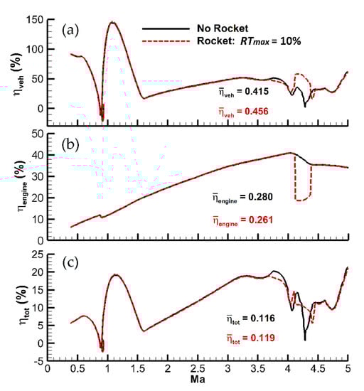 According to the description of Figure 1 and Figure 2, introducing a small rocket to assist the TBCC could significantly increase the vehicle efficiency, , in the transonic and mode transition. Although the engine efficiency, , may be reduced when the rocket works, the rocket-augmented strategy is still possible to improve the local total efficiency , as shown in Figure 3. It is to be noted that is defined as follows: