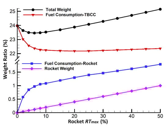 In Figure 9, when the rocket thrust is relatively small (RTmax < 6%), as the thrust of the rocket increases, the fuel consumption of the TBCC reduces rapidly. Even if the fuel consumption and the weight of the rocket are increased, the total weight of consumption is still reduced. It is noted that the total weight in Figure 9 is the sum of the fuel consumption of the TBCC, the fuel consumption of the rocket, and the weight of the rocket. As the thrust increases (RTmax > 6%), the fuel consumption of the TBCC increases slowly, which is due to the increase in the drag. In the meantime, the weight and the fuel consumption of the rocket increase almost linearly. Consequently, the total weight of consumption is at a minimum value when the relative thrust of the rocket is about 6%, which is 2.2% less than the total weight consumed by the vehicle without the rocket.