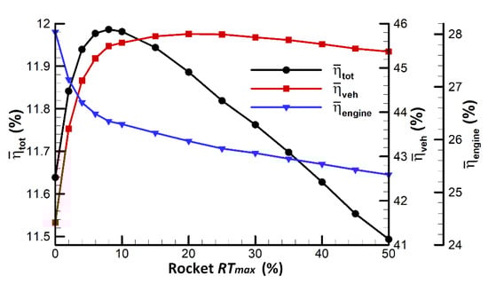 According to Equations (18) and (19), Figure 10 shows the variations in the average efficiencies with the rocket thrust. With the rocket RTmax increasing from 0% to 8%, the has a sharp increase (9.6%) while the drops by about 6%, which results in a 3% increase in the . With the rocket RTmax further increasing (RTmax ≥ 8%), the shows a slightly decreasing trend and the keeps decreasing, so the starts to decrease.