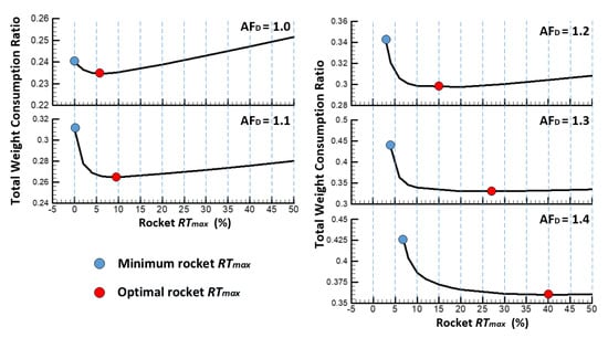 Effect of rocket RTmax on total weight consumption under different AFD.