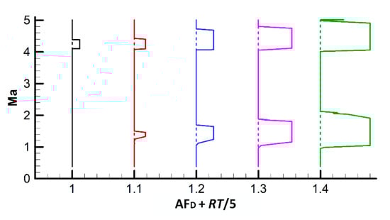 Figure 13 shows the thrust profiles of the rocket under different AFD over the entire Mach range. To compare the thrust, the combined variable of AFD and rocket relative thrust RT is on the horizontal axis. It is to be noted that the RT is the product of the maximum relative thrust, RTmax, and the throttle, Thr. The distance from the solid line to the dotted line represents the relative thrust of the rocket. With the increase in AFD, the operating range of the rocket expands in transonic and mode transition, and the value of the optimal thrust increases. This could be explained in that the expansion and deepening of the thrust gaps with the increase in the AFD call for a bigger thrust and a longer operation time of the rocket. In addition, under each AFD, the rocket almost operates at the corresponding maximum thrust constantly in the operating range. It means the fixed-thrust design of the rocket could satisfy the thrust requirement.