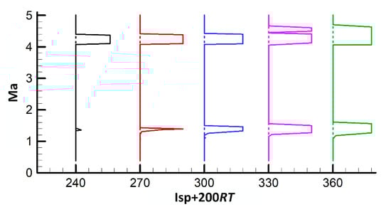 Similarly, Figure 14 shows the thrust profiles of the rocket under different Isp over the entire Mach range. Under the AFD of 1.1 but different Isp, the maximum values of the thrust are approximately equal. The higher the Isp, the less the reduction in the engine efficiency caused by the rocket. Therefore, the operating ranges of the rocket are widened. In the case of Isp = 240 s, the rocket hardly works in the transonic, while in the case of Isp = 360 s, it operates in the range of Mach 1.18 to 1.56.