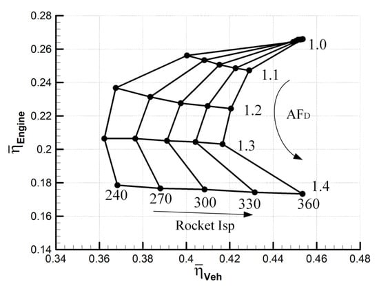 Figure 15 shows the average vehicle efficiency, , and the average engine efficiency, , corresponding to different Isp and AFD. With the increase in Isp, the increases due to the expansion of the rocket operating range, while the is roughly constant after including the effect of the improved engine efficiency of the rocket. When AFD = 1.4, as the Isp increases from 240 s to 360 s, the is improved from 0.368 to 0.453, an increase of 23.1%. By comparison, when AFD = 1.0, the Isp has little effect on the and the , because the operating range of the rocket is very small. With the increase in AFD, the decreases first and then increases. In low-AFD cases, the TBCC provides most of the thrust for acceleration, and the rocket works within a narrow range, serving as auxiliary power. The increase in drag decreases the . By comparison, in high-AFD cases, the TBCC works independently in a narrow range. The rocket widens the operating range and increase the thrust of itself, and becomes a great part of the propulsion system. Due to the increase in rocket thrust, the increases.