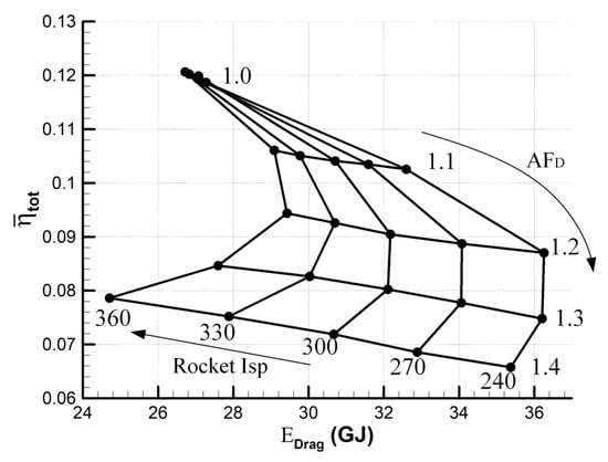 Figure 16 shows the average total efficiency, , and the total energy consumption of drag, EDrag, corresponding to different Isp and AFD. With the increase in Isp, the increases, because the increases, and the remains almost unchanged. Meanwhile, the operating range of the rocket is widened and the EDrag is reduced. When AFD = 1.4, as the Isp increases from 240 s to 360 s, the is improved from 0.066 to 0.079, namely an increase of 19.7%, and the EDrag is decreased from 35.37 GJ to 24.71 GJ, namely a decrease of 30%.