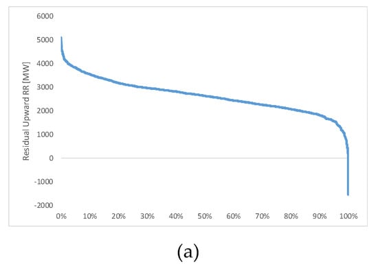 In order to test the economic impact of the new methodology, additional simulations have been carried out for computing the difference in terms of reserve procurement costs for the six days under assessment (one working day and one Sunday of 3 different months of the year)—the official algorithm and tools actually adopted for clearing the Ancillary Service Market has been used, fixing all the other input data except for the RR requirements. Figure 11a shows that there are no significant market cost differences when switching to the new RR requirements defined according to the BGMM approach. However, considering that RR requirements are implemented in form of soft constraints, a potential deficit of resources for the procurement of downward reserve in the North zone could appear (with a relevant penalty in the objective function), as shown in Figure 11b, where the percentage of the coverage of the requirement for the RR in the North zone for the six reference days are represented. Therefore, through the application of the new methodology, the higher value of downward reserve requirement in the North zone is difficult to be fulfilled (given the current set of available resources), highlighting a lack of downward reserve for coping with the 99.7% reliability standard (only an extraordinary use of pumped-storage could mitigate this issue).