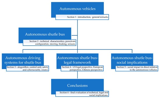 The configuration of these means of transport is highly similar to the general platform of the AVs, yet there are several differences that differentiate them and these aspects have been pointed out in the following sections of the paper: the section related to the powertrain, the section related to the steering, the section related to the braking, section explaining the sensors (the positioning, the type, their coverage) all differ that the “classical” AV, autonomous driving algorithm, security.