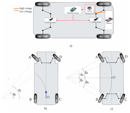 Figure 5 presents an overview of the steering system (a) and the other two steering systems that can be found on autonomous shuttle buses: a steering system with two steering wheels and (b) a steering system with four steering wheels (c).