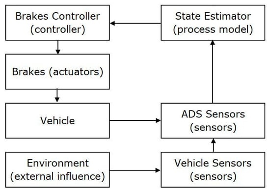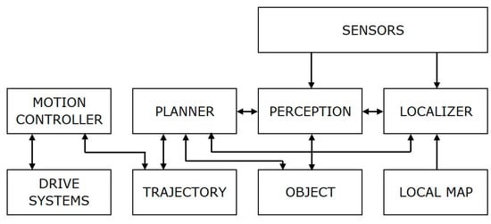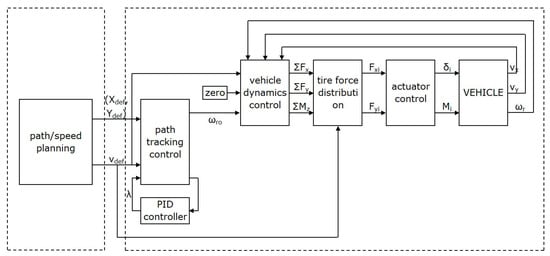 Figure 7) is to compare the current position of the AV with the alignment of the planned trajectory. Depending on other aspects, such as comfort and the current speed of the AV, the controller generates control over the steering system based on the vehicle’s speed. The centralized control structure is based on the characteristics of the vehicle’s dynamics, and the subsystems are controlled directly by a centralized controller. The controller’s design is generally based on linear or nonlinear models, and the method for designing a multi-output multi-input system (MIMO) is adopted to solve problems related to longitudinal and lateral vehicle dynamics [