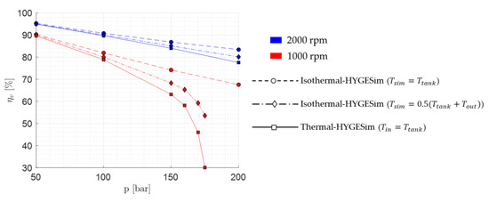 At 1000 rpm, 200 bar, the thermal-HYGESim model predicts zero volumetric efficiency (the leakage flow exceeds the delivery flow) indicating that the EGM is inoperable at that operating condition. However, the isothermal model (set 1) predicts .