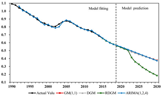| Year | Real Value (Tons per 10000 RMB) | GM (1,1) | DGM | RDGM | ARIMA |