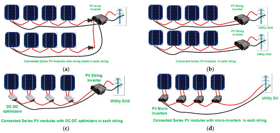 Traditional and recent photovoltaic (PV) architectures: (a) traditional system with centralized inverter; (b) traditional system with string inverters; (c) traditional system with string inverters and direct current (DC) optimizer; (d) recent PV architectures (module inverters).