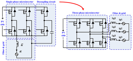 Using a reliable film capacitor that has a long life needs an additional circuit called a decoupling circuit [39]. This circuit adds more challenges for control and for the general performance of single-phase microinverter topologies. As shown in Figure 2, the single-phase with decoupling circuit has the same component counts of a three-phase microinverter. Moreover, the third leg processes additional power in the three-phase microinverter instead of the decoupling function in the single-phase one. The decoupling capacitors on PV side, DC link side, and AC side can be significantly reduced in the three-phase case and avoid the expense of less reliability and more system complexity [40,41,42]. Furthermore, three-phase microinverters based on identical modular three legs (Figure 2) have simpler control and are the most preferably used ones.