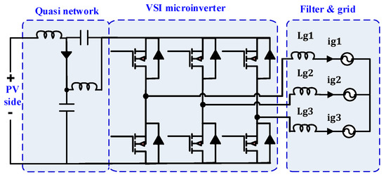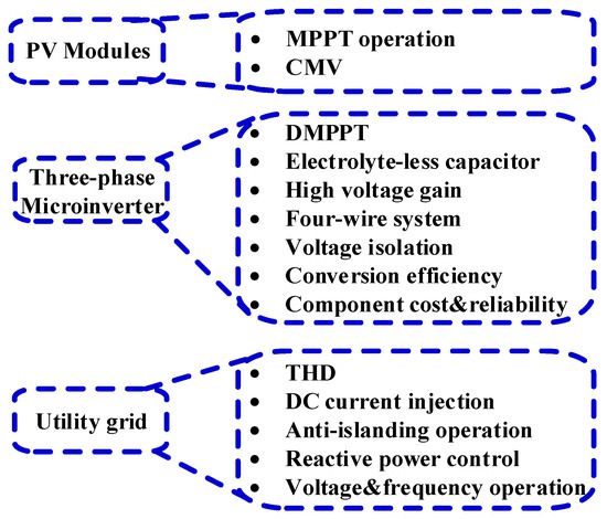 Figure 3 shows the main parts and the corresponding features of the three-phase microinverters. These are PV modules, three-phase inverters, and the utility grid. The microinverter is responsible for optimum energy transfer between the PV modules and the utility grid. It does so by processing the DC power of the PV source and converting it to an AC power injected into the grid. Per Energy Information Administration (EIA) standards, the feature requirements for the PV module and the grid are a matter of concern. Detailed functions for each system part are summarized below.