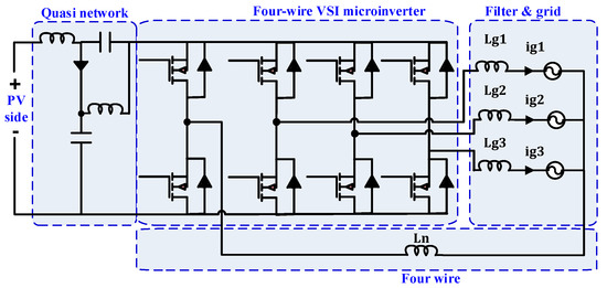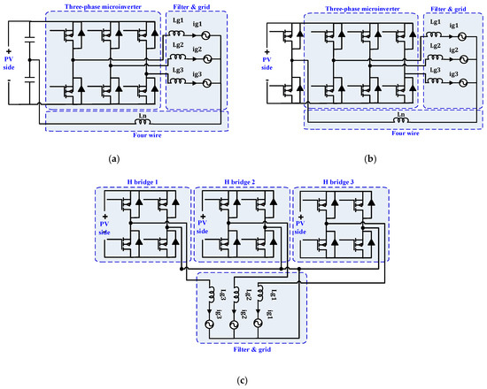Different ways to supplement four-wire at three-phase microinverters: (a) split capacitor four-wire microinverter; (b) four-leg four-wire microinverter; (c) added four-wire for three independent phases.