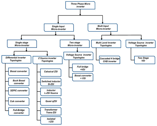 Three-phase microinverters and their associated topologies have not been widely discussed in the literature; yet they are considered one of the most prosperous inverter solutions for the previously discussed problem. This solution replaces the single-phase inverter solutions and its severe problems, especially at modern PV module architecture as discussed in Section 2. This paper fills this gap in Section 3 by presenting the three-phase microinverters’ strong points versus single-phase microinverters. Section 4 demonstrates the required standardized features of PV module architectures, including PV modules, the grid, and microinverter topology. Then, the possible topologies which provide high performance in PV module architecture are chosen by identifying the topologies with the minimum component counts, simple construction, and easy control as provided in Section 5. Section 6 presents a comprehensive assessment for all selected topologies of three-phase microinverters based on the developed classification. Finally, the main recommendations are followed by a general conclusion given in Section 7.
