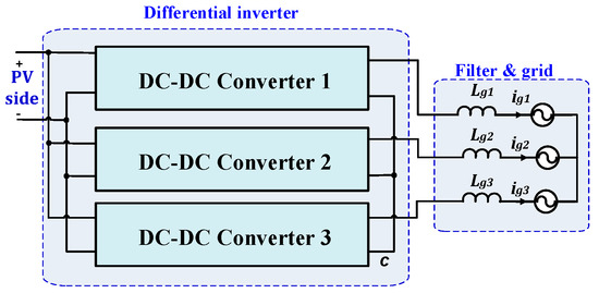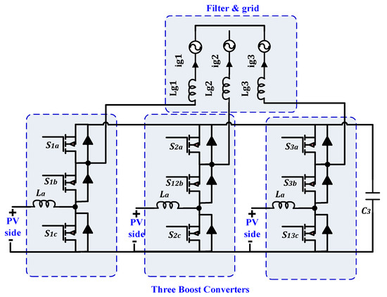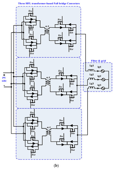 The second configuration is the multi-input three-phase microinverter, which implements the DMPPT concept. Each PV module or group of modules are connected to one phase of the inverter. Therefore, this configuration can utilize high voltage gain and DMPPT with a low number of components resulting in increased power density. Other features of the multi-input three-phase inverters are as follows [43]: