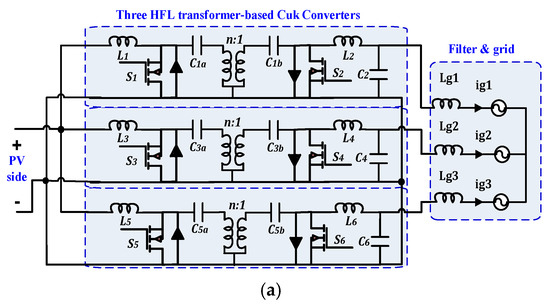 - Darwish, A.; Holliday, D.; Ahmed, S.; Massoud, A.; Williams, B.W. A Single-Stage Three-Phase Inverter Based on Cuk Converters for PV Applications. IEEE J. Emerg. Sel. Top. Power Electron. 2014, 2, 797–807. [Google Scholar] [CrossRef]