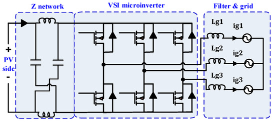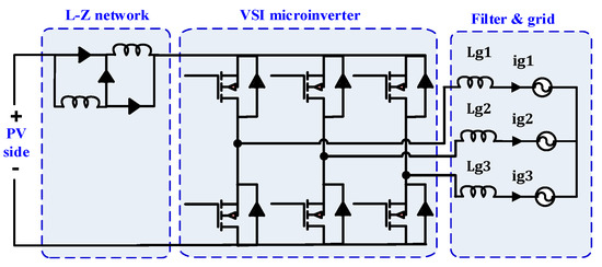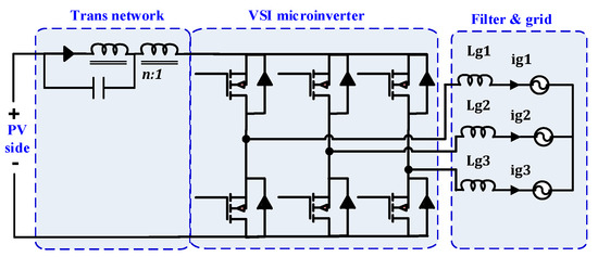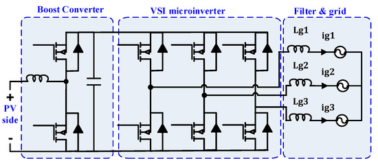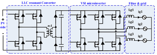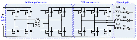 In new PV module architectures, the microinverters have been developed based on several different configurations. The simplest one is the traditional single-input single-phase voltage source microinverter shown in Figure 2. The power of one or more PV modules supplies the DC side of the inverter and achieves the maximum power operation using MPPT controllers.